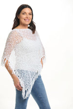 A Patchington classic, this pullover poncho features popcorn knit fabric with a pointed asymmetrical hemline and an upgraded fringe detail.
