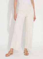 Made from 4-way stretch Knit Denim, these high-waisted, wide-leg jeans feature a concealed patented waistband, back patch pockets with gunmetal studs, beltloops and topstitching. Offering an extra-wide leg without side seams, the Erin High Waist Wide Leg Denim showcases a cropped, ankle length and raw-edge hem that’s simple to shorten.