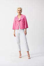 Swing into the season in this foiled faux suede jacket. A classy notched collar, flared three-quarter sleeves, and relaxed fit create a polished transitional piece you'll love to wear again and again.
