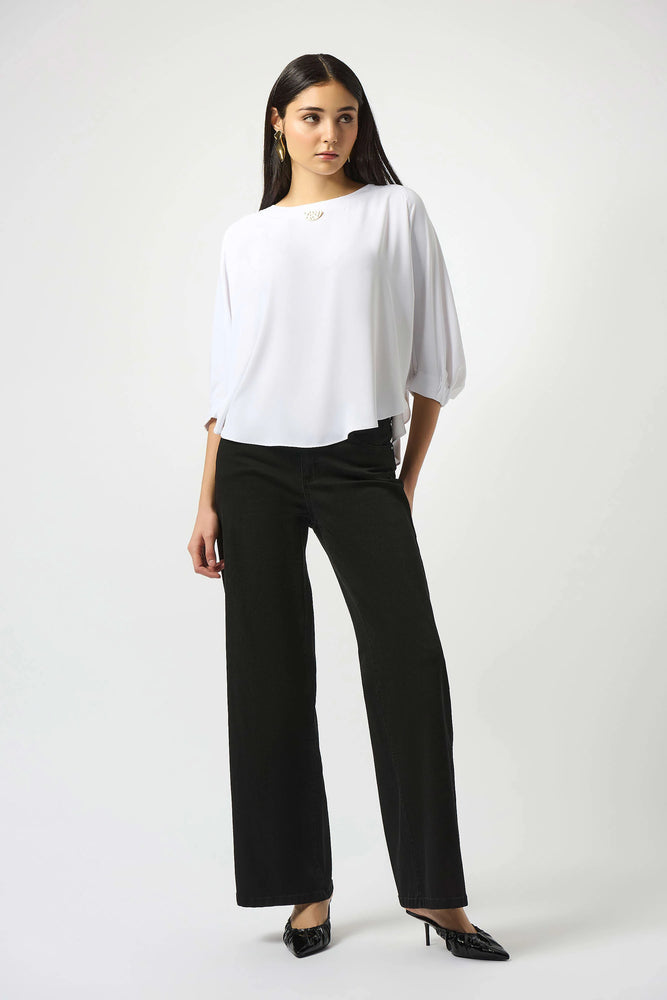 Revel in the relaxed elegance of this recycled twill top. The garment features a boat neck with sleek back keyhole opening for a chic touch. The three-quarter dolman sleeves with wide elastic detail at the hem lend a polished look and pair beautifully with the piece’s bold boxy silhouette.