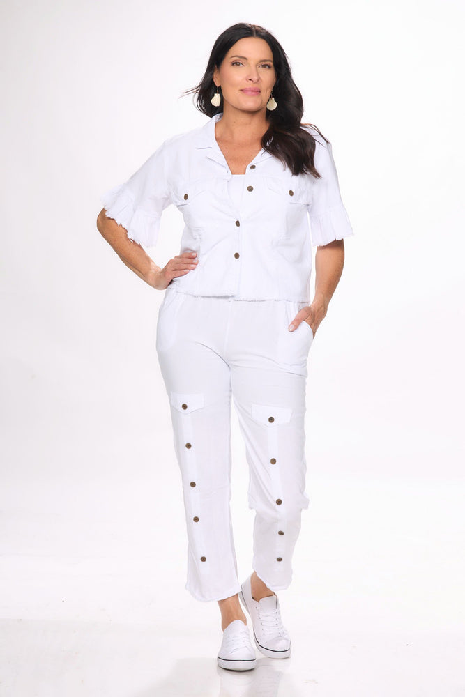 We love a lightweight layering item for the summer season. Available in dark denim and solid white. Style with the coordinating wide leg button detail pants for the complete outfit.