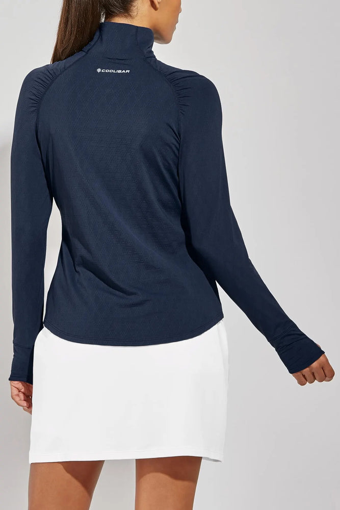 The Arabella Quarter-Zip features the beautiful, light jacquard knit diamond texture of Coolibar's Active Diamond™ fabric. The soft detailing of the stitching amplifies the flattering ruching on the shoulders and along the zipper of this fitness quarter-zip. The UPF 50+ coverage extends even further with the stand-up collar and unique hem that curves perfectly along the top of the hand.