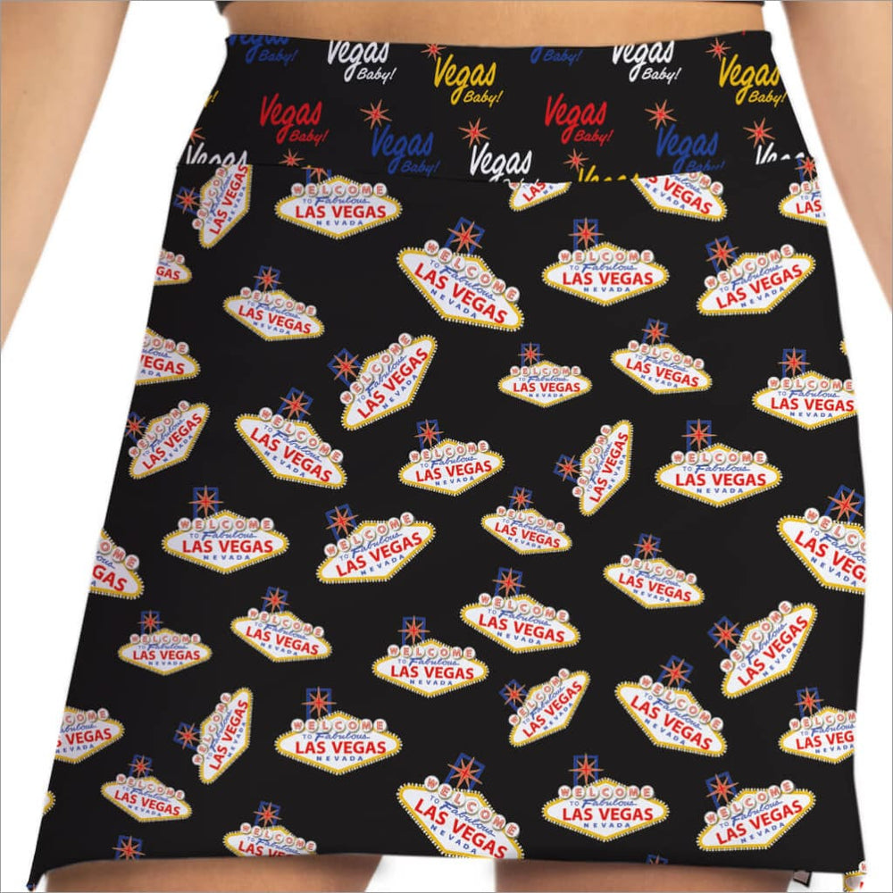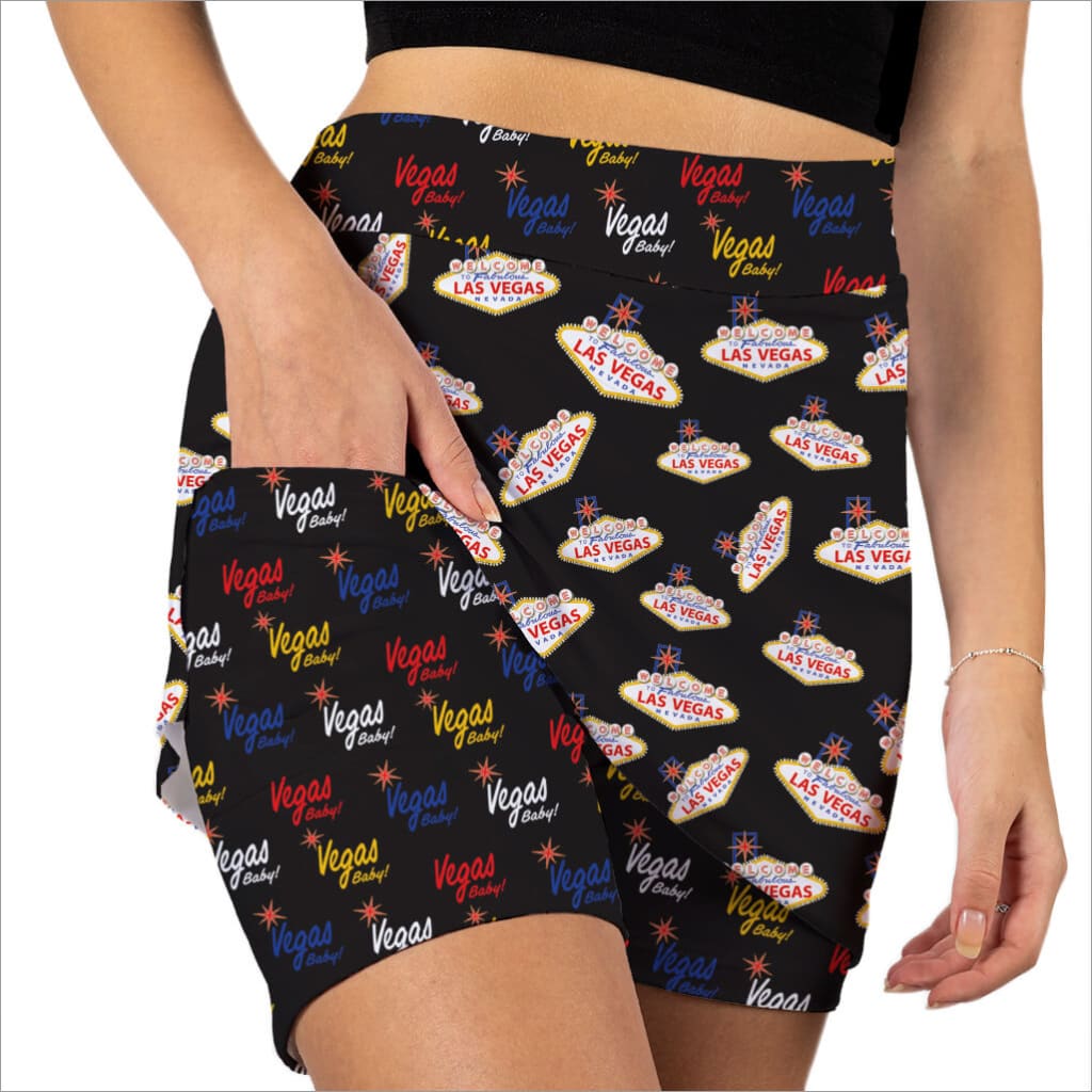 Embrace the latest trends with this chic black skort, inspired by the vibrant energy of Las Vegas. The clever combination of skirt and built-in shorts allows you to move freely and confidently, without compromising on style. The two distinct prints on the skirt and shorts not only match but also enhance each other, creating a look that's both eye-catching and sophisticated. Perfect for those who value fashion and functionality in equal measure.